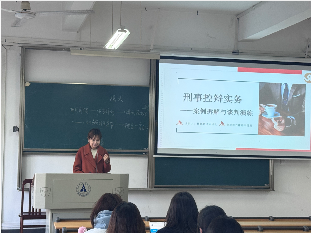 为持续深化法学教育教学改革、创新实务教学模式、提升学生的法律实践能力,2025年11月25日下午,在我校2025级法律硕士的《法律谈判》课堂上,任课教师、法学实验教学中心秘书长邓晓静副教授,专程邀请湖北维力律师事务所林晓璐律师团队以刑辩实务为专题进行实务教学。